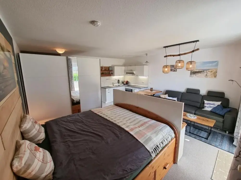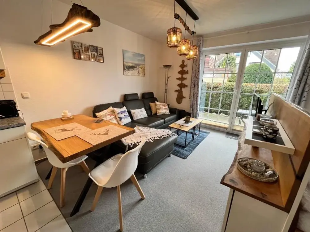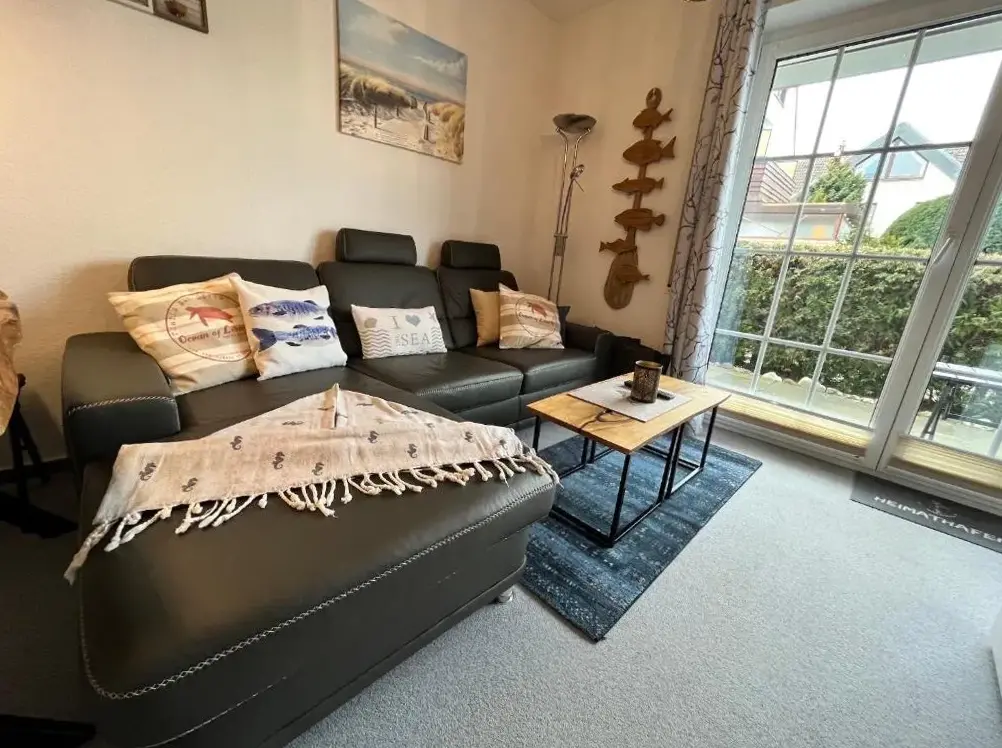 Lejligheden ligger i et stort område, hvor du med blot et par minutters gang kan nå både dypet og Dühnenparken. Lejligheden er godt udrustet og har næsten alt hvad man kunne ønske sig. Udenfor findes det mulighed for at sikre cyklerne sikkert. Der er også en separat parkeringsplads tilhørende lejligheden. En stor fiskecafé er direkte på gaden.